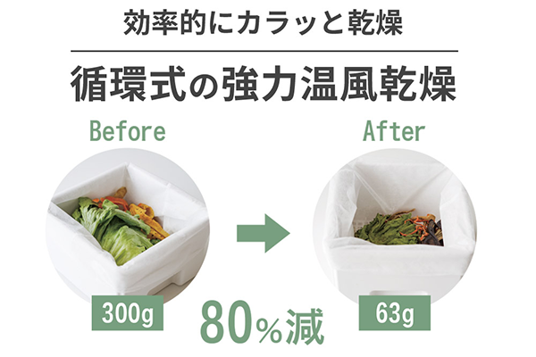 乾燥方式は温風をあてて乾燥させるので、生ごみの水分を効率的に乾燥させます。